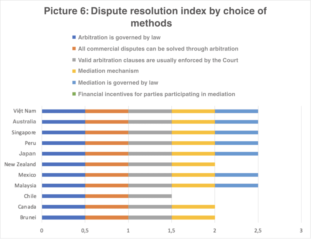 According to DBR 2020 data, all CPTPP members have high scores in the arbitration criteria (1.5 out of 1.5 points). Also according to DBR 2020 data, some CPTPP members do not have national laws regulating the mediation mechanism, such as Brunei[8], Canada[9], New Zealand[10] or have not recorded voluntary mediation in Chile[11] because Chile has only started promoting the mediation mechanism since 2018[12]. However, Chile is one of the 46 countries that signed the Singapore Convention on Mediation on the first day of the Convention’s opening for signature (August 7, 2019). Three other CPTPP member countries, Singapore, Brunei and Malaysia, also signed the Singapore Convention on Mediation on the same day[13]. This demonstrates the interest of CPTPP member countries in the mediation mechanism, regardless of whether their domestic laws have been fully developed.