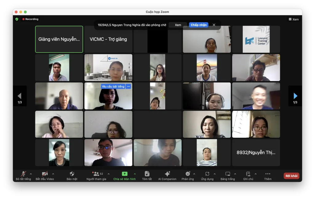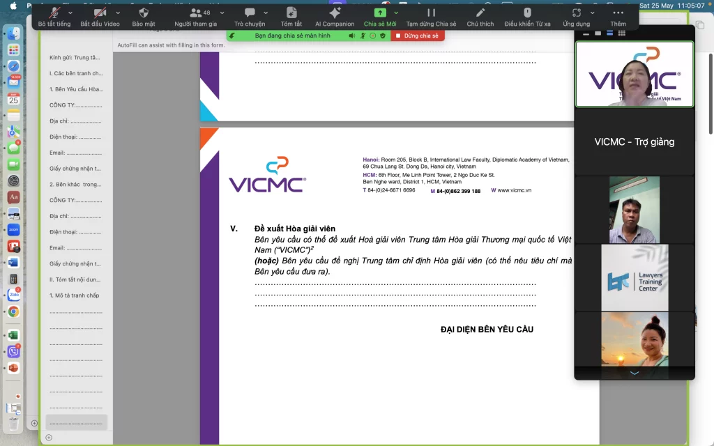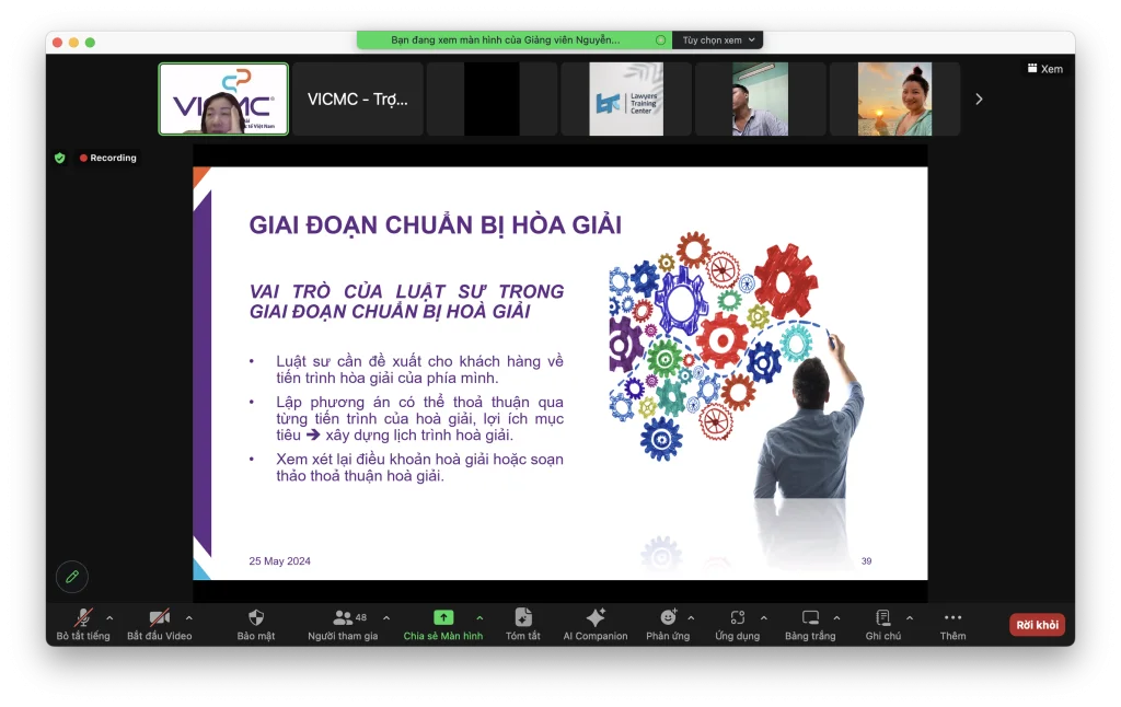 On May 25, 2024, a training course for lawyers with the topic “Skills of lawyers in mediating commercial disputes” was held by The Vietnam Lawyer Professional Training Center ( LTC ) under the Vietnam Bar Federation via the Zoom platform with the participation of lawyers.